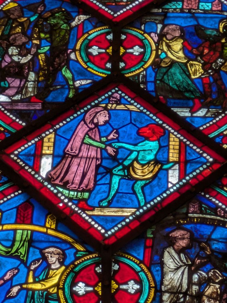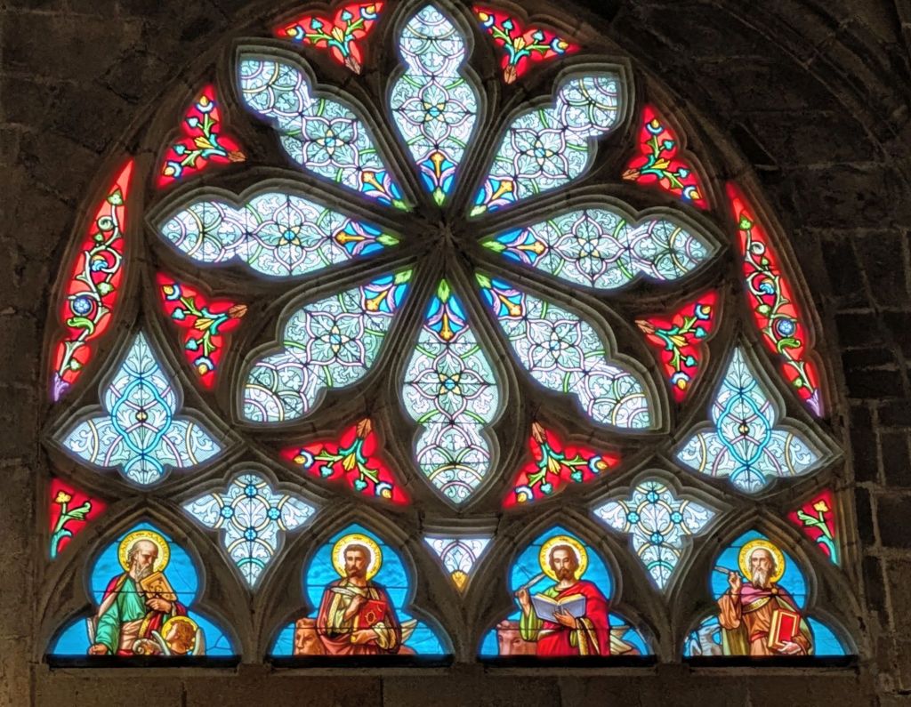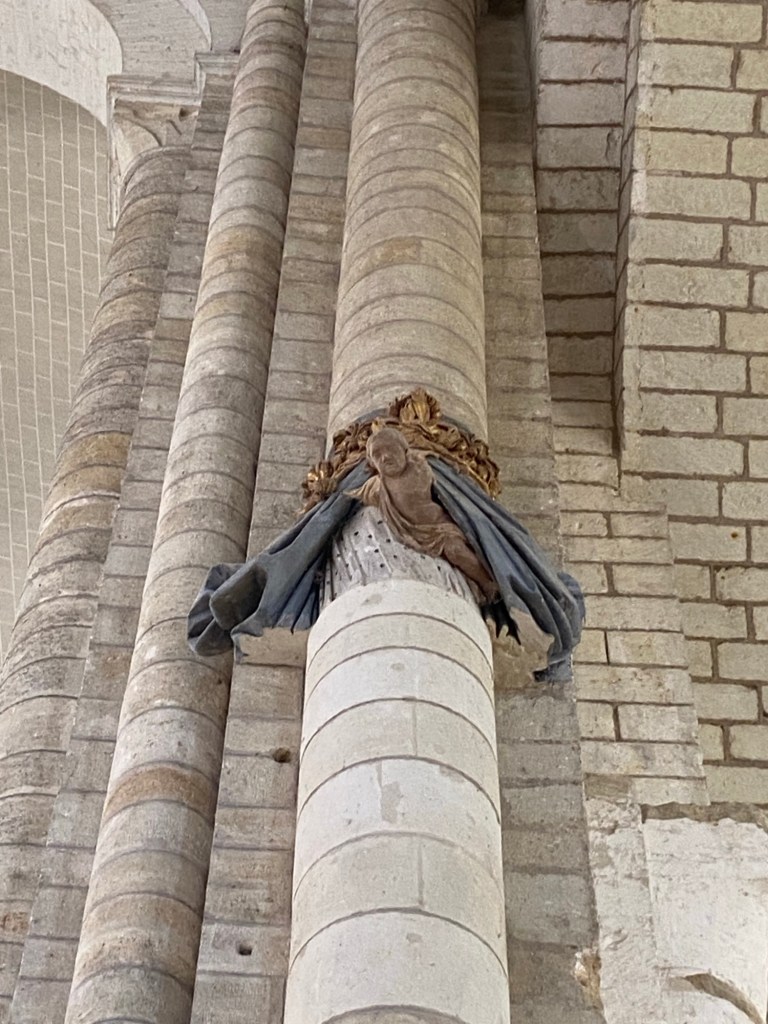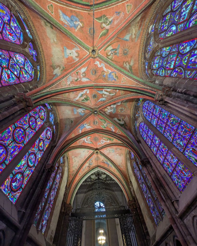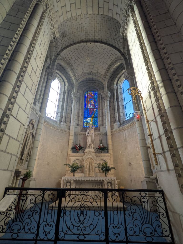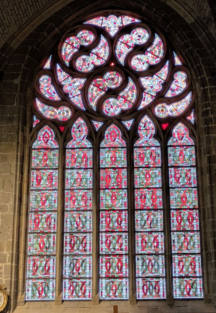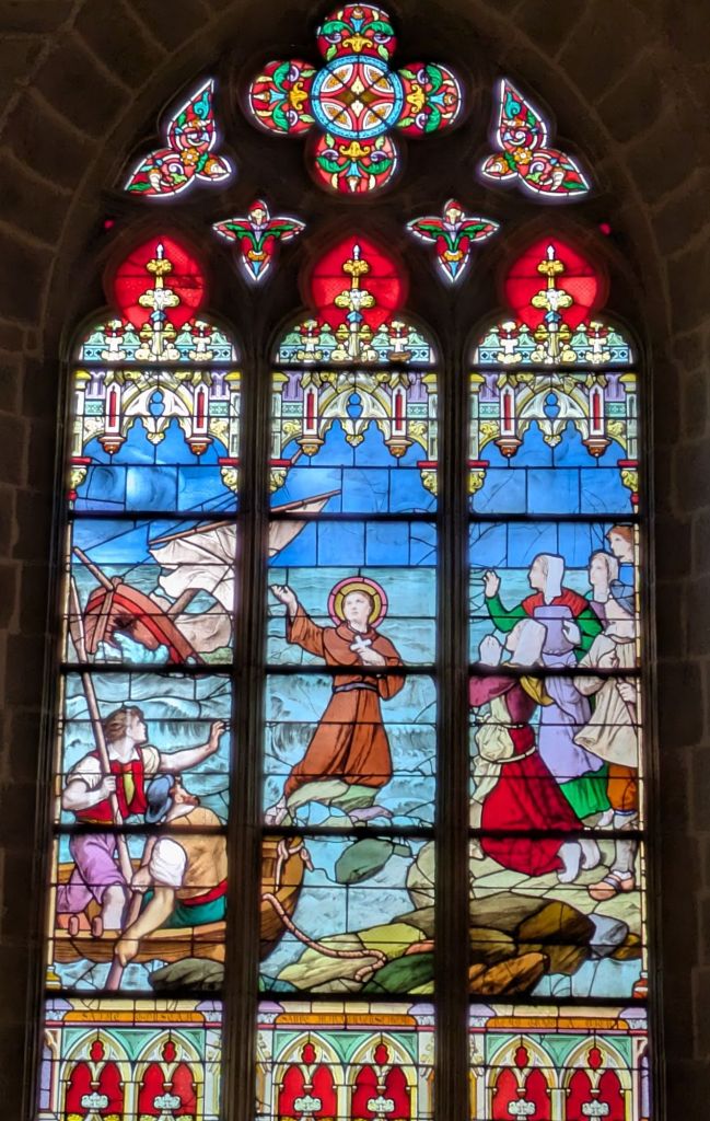 We came upon this old church, St. Benôit du Mans. First built in the 12th century, then rebuilt in the 15th and 16th, sitting on top of the Roman ruins. The most interesting thing about it was the stained glass window in the ceiling, and that it is dedicated to an Italian Saint named Scholastica, with a crypt containing her supposed humerus. All of these windows are from the 18th century.