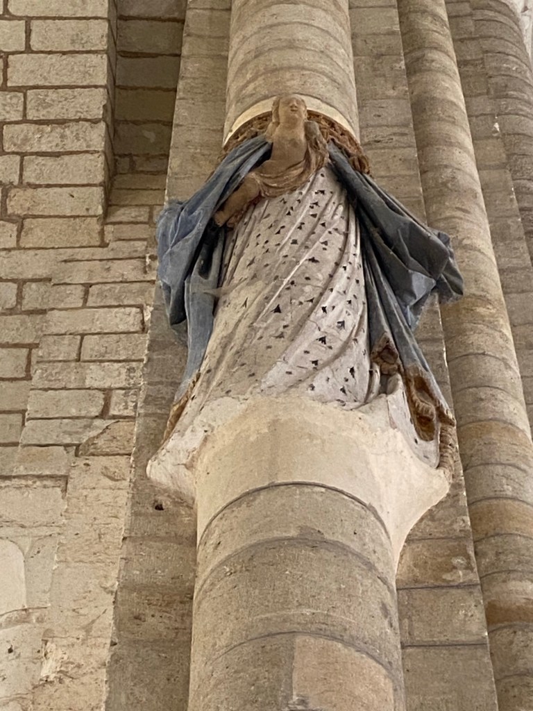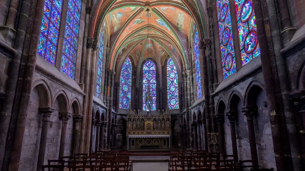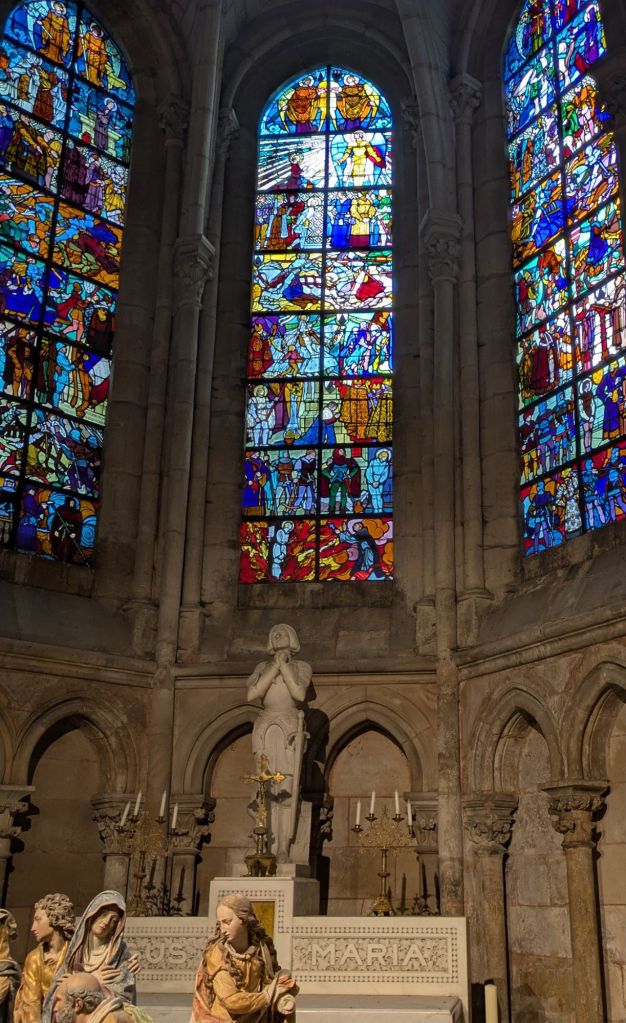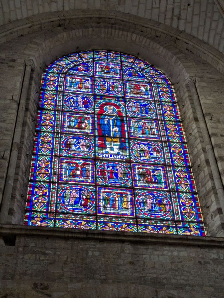 The greatest feature of the cathedral is that it holds the oldest, intact, stained glass window in its original position, in the world. Close by is the second oldest in France. We stared at it for quite a long time, just soaking it in. Simply awe inspiring to be in the presence of this artistry.
