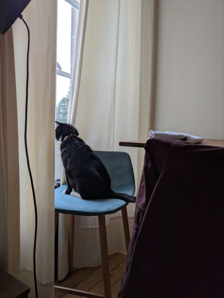 The latest development is that Penny got brave this morning and for the first time, spent time looking at the window at the cars, bikes and people running by.