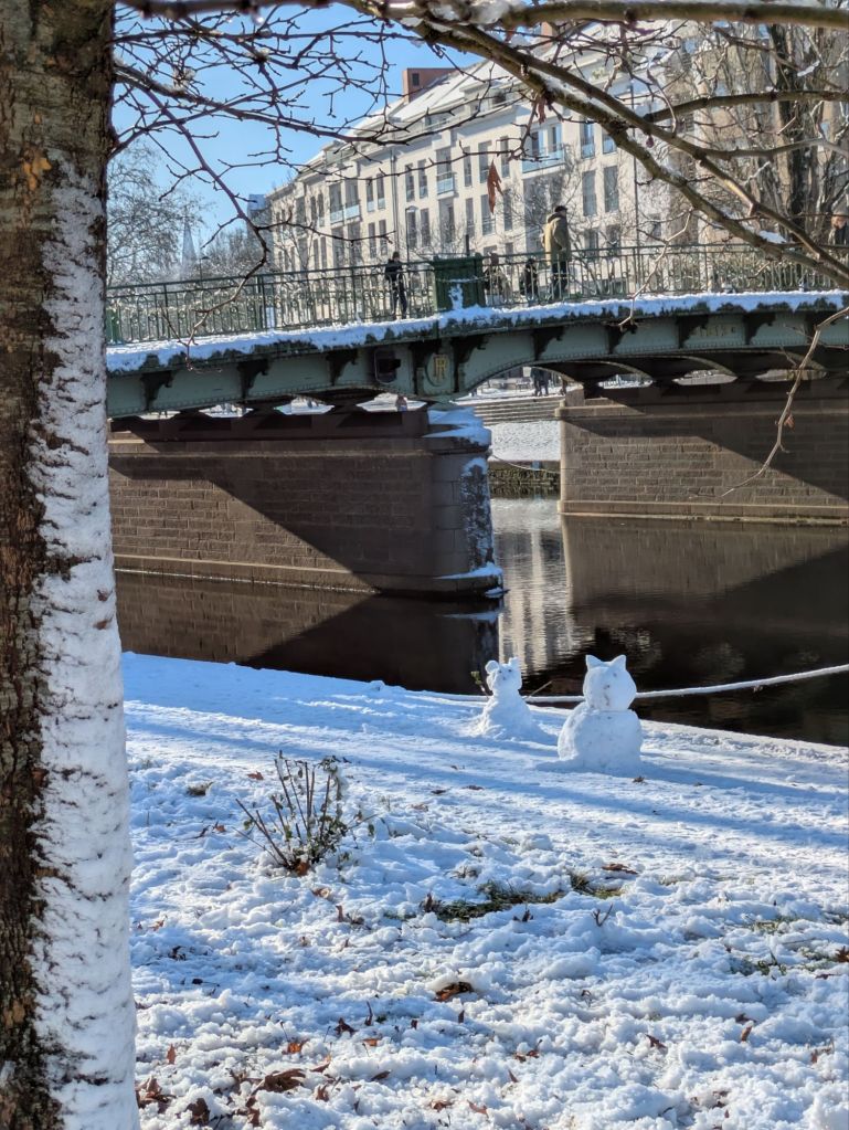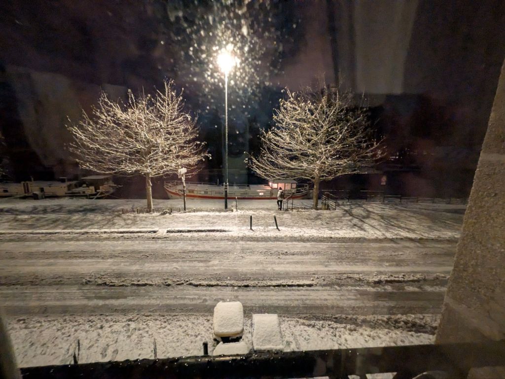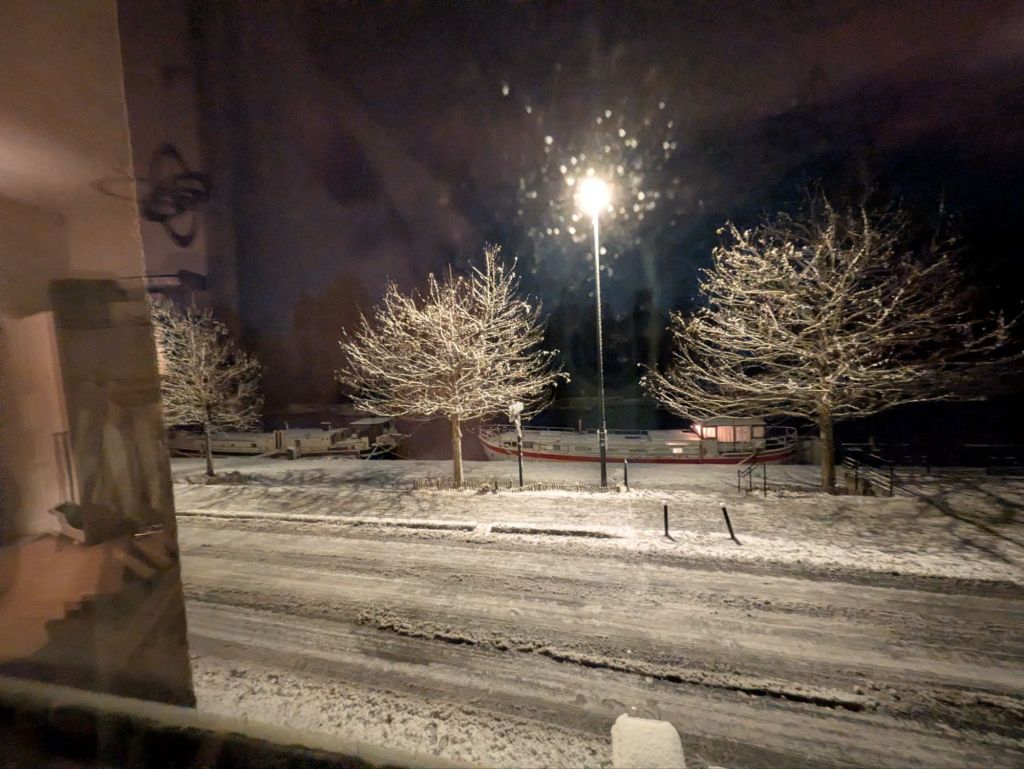 And then last night it started raining big cold sloppy drops of rain right as we were going out for an evening walk. Then it turned into a real snow around 10:00. I was so tired, falling asleep, and Terry said, “come look!” Then people came out in droves. Kids laughing and running around. Throwing snowballs, making snowmen. Dogs jumping and delighting. It was way too exciting to sleep! And now, in the very early hours, this bustling noisy city is silent. No trains, no cars, no sirens. The constant stream of cyclists commuting to work has vanished.