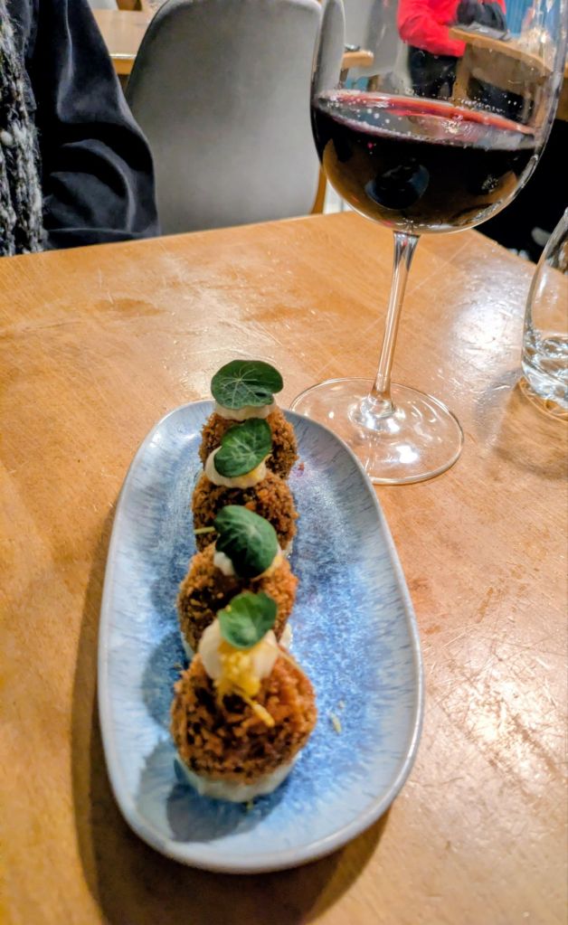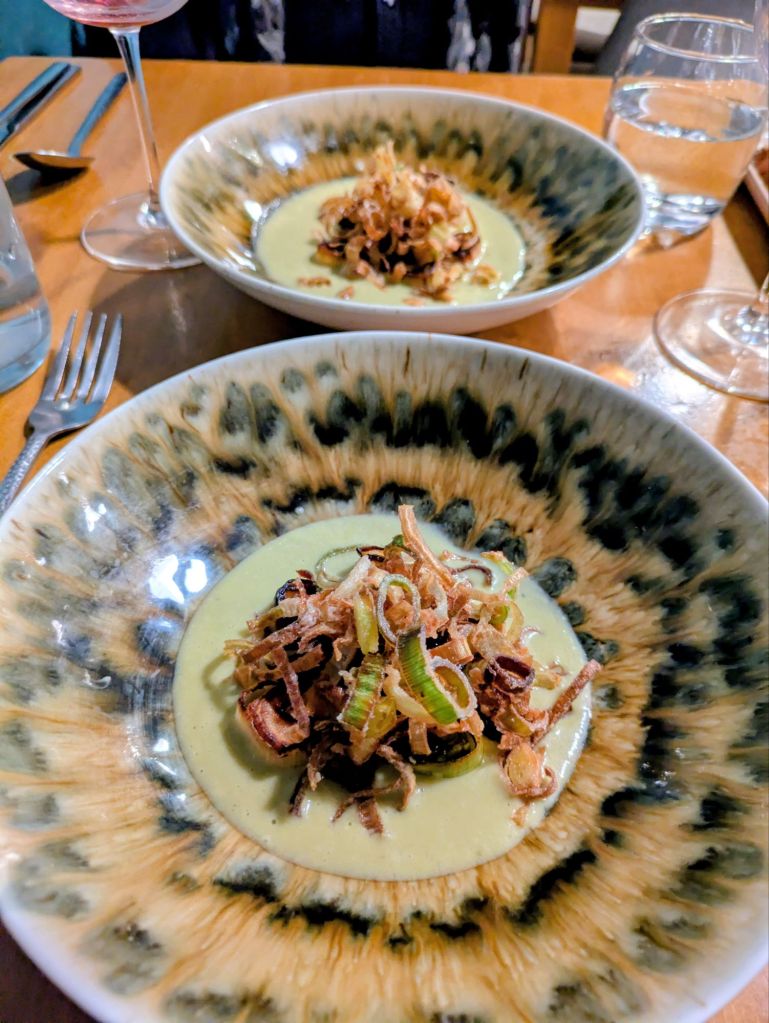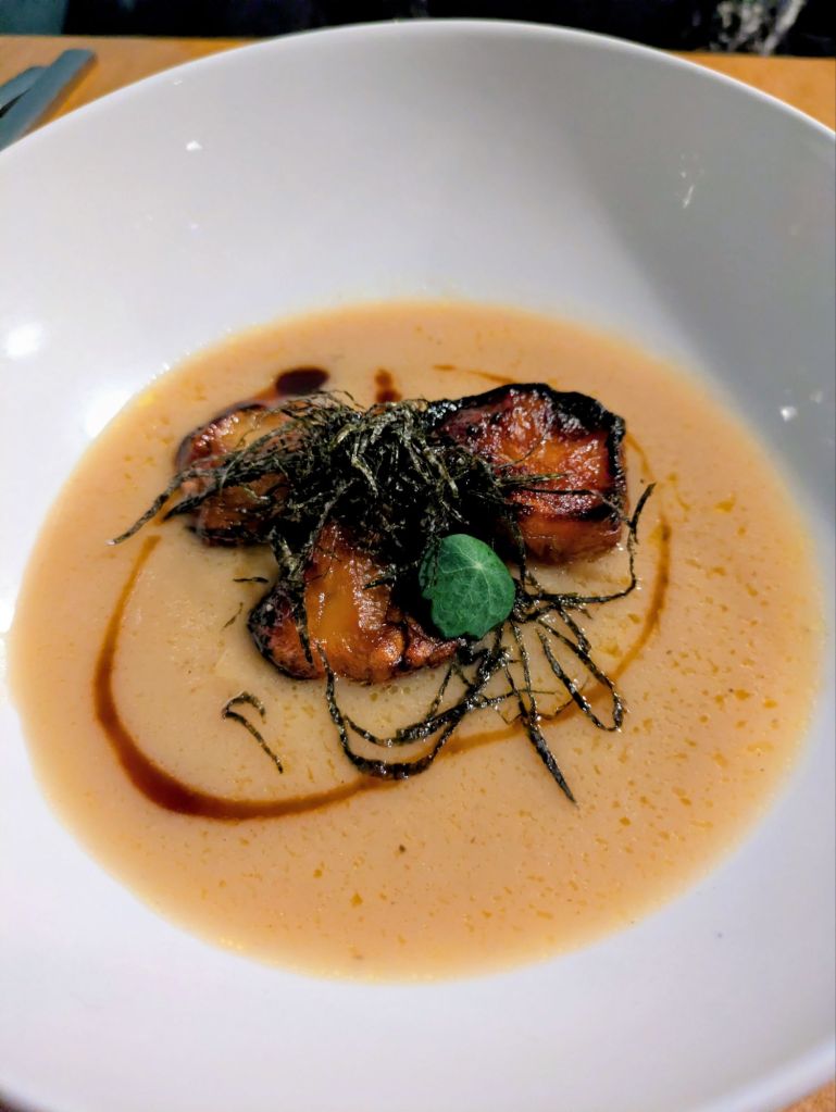 Fritters of brussel sprouts and garlic almond aioli and zest of orangeCoconut curry soup, pan roasted leeks and fried leaksSalsify velouté with pan roasted SunchokesMushroom risotto with mâcheCocoa encrusted poached pear with cashew mousse
