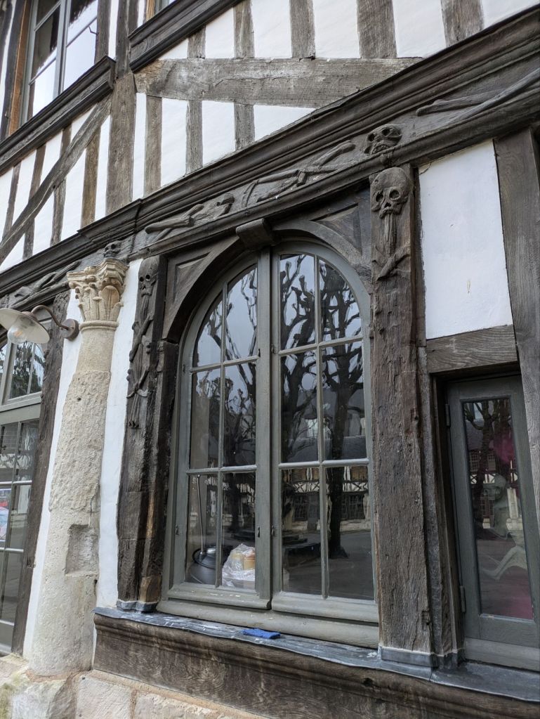 Part of the interesting and dark history was the Black Plague, which killed 2/3 of the population. They dug a mass grave, filled with bodies and lime, surrounded by buildings to house the not-yet-dead. The timbers of these houses are carved with skulls and digging implements.